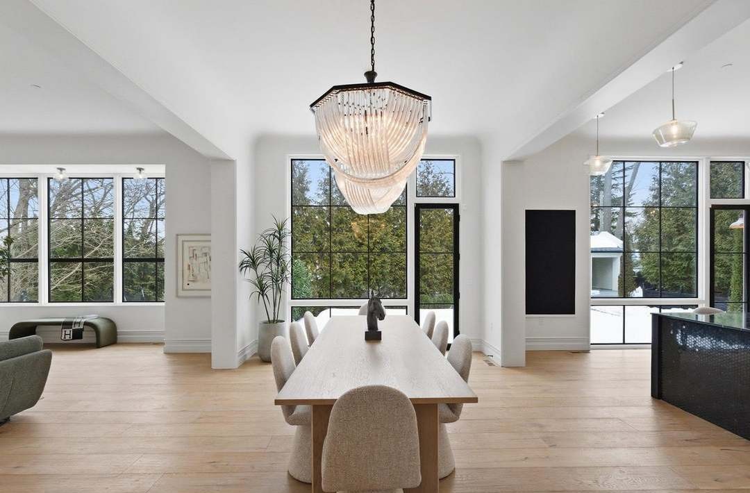 A sophisticated open-concept dining area bathed in natural light from expansive floor-to-ceiling windows, featuring a light wood dining table with upholstered linen chairs and a striking sculptural pendant chandelier. The space exemplifies contemporary transitional design with vaulted ceilings, crisp white walls, rich hardwood flooring, and minimal ornamentation, creating an airy yet refined atmosphere that balances modern sensibility with warm, natural materials.