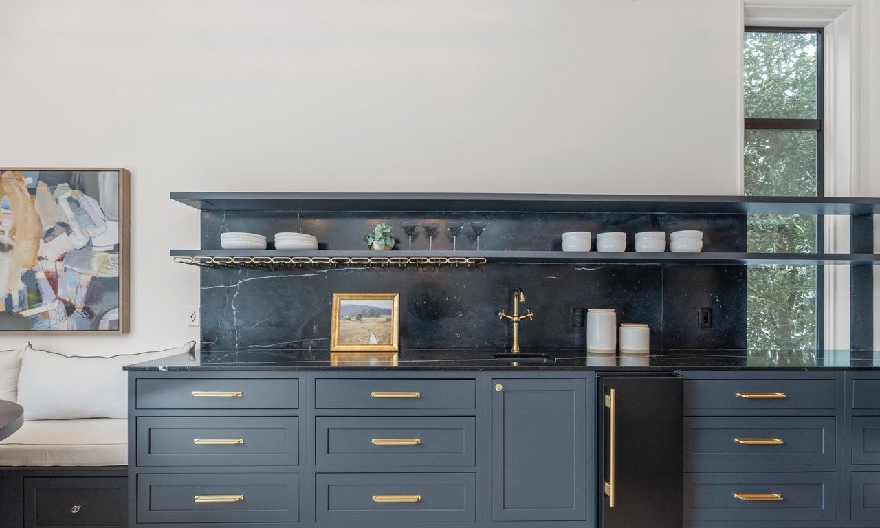 A sophisticated built-in bar featuring dark navy painted cabinetry with brass hardware, black marble countertops and backsplash, and open shelving with decorative vessels and accessories. The dramatic, moody aesthetic is enhanced by the floor-to-ceiling windows overlooking greenery and the refined material palette of marble, brass, and deep navy tones.