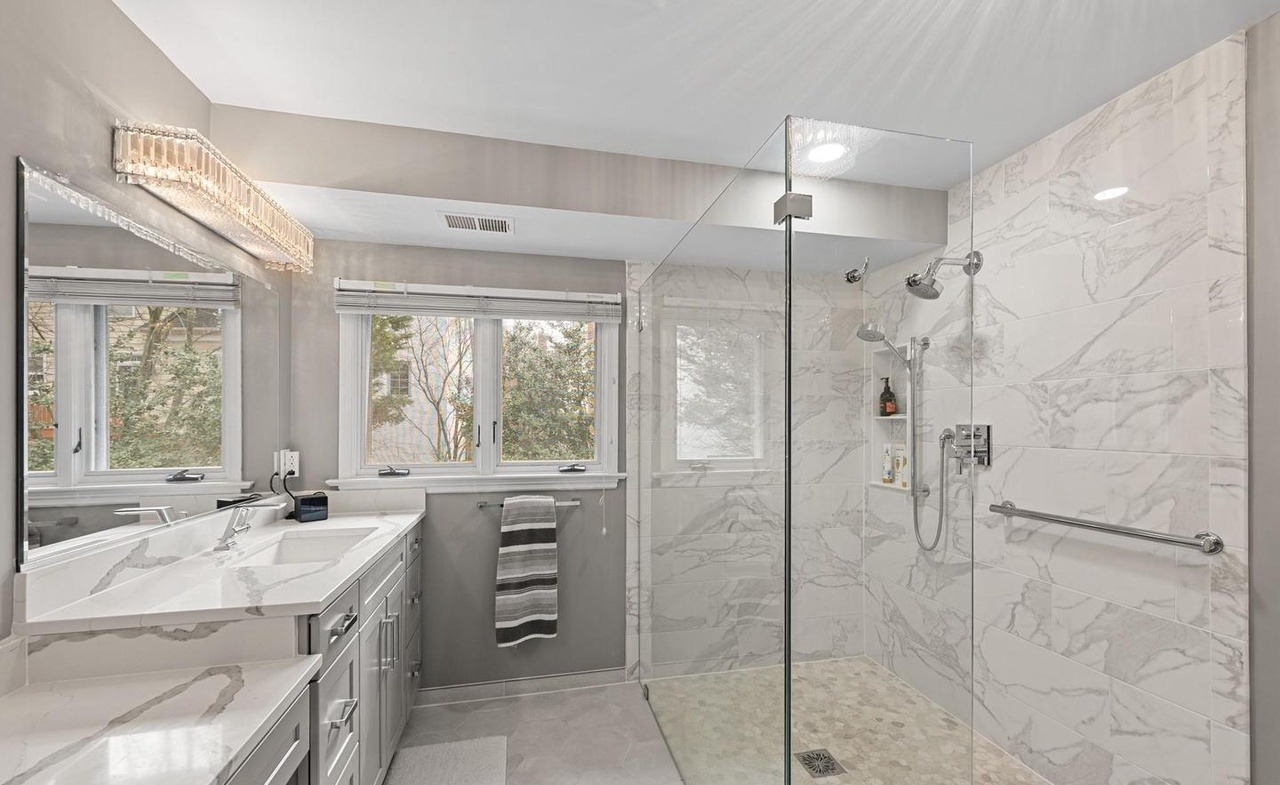 This sophisticated primary bathroom showcases a serene palette of marble, gray painted cabinetry, and abundant natural light from oversized windows overlooking the landscape. The spa-like walk-in shower with frameless glass enclosure, rain head, and marble surround combines luxurious materials with clean, contemporary lines, exemplifying high-end transitional design.