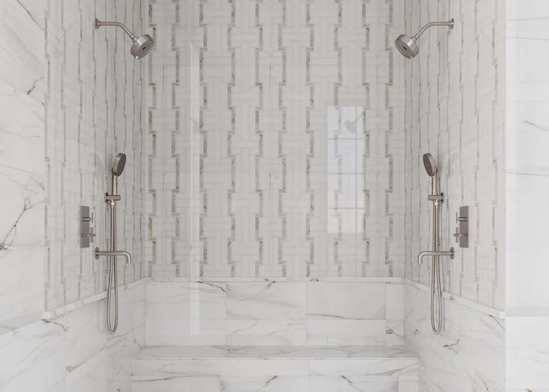 Walk In ShowerDual Shower HeadsRainfall ShowerheadHand ShowerFrameless Glass EnclosureMarble FlooringHigh Ceilings