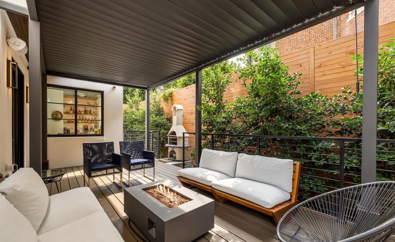 Fire PitCovered PatioBuilt In ShelvingOutdoor Kitchen Prep AreaPergola OverhangMetal RailingLounge SeatingFireplace
