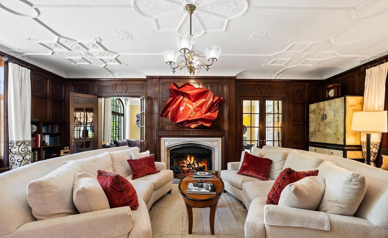 A stately formal living room featuring rich dark wood paneling, coffered ceiling with ornamental plasterwork, and a working fireplace as the dramatic focal point accented with a vibrant red sculptural art piece. The space balances traditional architectural details with contemporary furnishings—cream-upholstered seating, jewel-toned velvet accent pillows, and brass hardware create a sophisticated glam aesthetic that feels both timeless and curated.