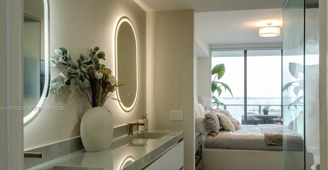 A serene, ultra-luxury en-suite bathroom featuring a minimalist floating vanity with sculptural backlit mirror, seamless frameless glass shower enclosure, and abundant natural light from expansive windows overlooking water views. The sophisticated palette of cream, white, and brass creates an organic modern sanctuary with museum-quality finishes and editorial-level design composition.