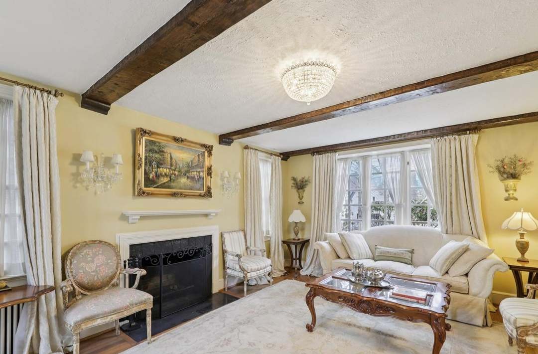 A stately formal living room bathed in warm yellow walls and abundant natural light from oversized windows, featuring exposed wooden ceiling beams, marble flooring, and traditionally-styled furnishings paired with sophisticated brass and crystal lighting. The layered design combines classic architectural elements with curated antique pieces and elegant upholstery, creating a timeless Hamptons-inspired retreat.
