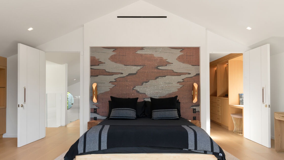 A stunning primary bedroom suite with a dramatic vaulted ceiling and striking textured accent wall featuring rust and gray tones. The space seamlessly blends organic warmth with modern minimalism, anchored by a custom black upholstered bed, warm wood accents, and elegant brass sconces, while expansive access to adjacent spa-like ensuite and dressing areas creates a luxurious retreat.