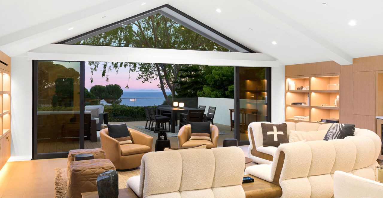 A breathtaking waterfront living room featuring dramatic floor-to-ceiling black-framed glass doors that seamlessly connect interior and exterior spaces, with a vaulted skylighted ceiling that floods the space with natural light. The sophisticated palette of cream, beige, and warm neutrals, paired with sculptural furniture, warm wood built-ins, and curated lighting, creates a serene yet luxurious retreat with unobstructed sea views and exceptional materiality throughout.