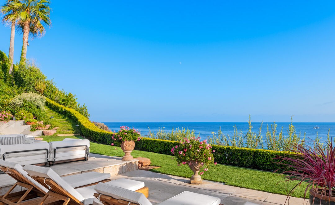 An expansive Mediterranean-inspired clifftop patio overlooking the ocean, featuring tiered manicured gardens with vibrant bougainvillea, palm trees, and sculpted hedges that frame an infinity of blue water and sky. The sophisticated lounging area with white cushioned seating merges seamlessly with the natural landscape, creating a serene luxury retreat where indoor-outdoor living reaches its pinnacle.