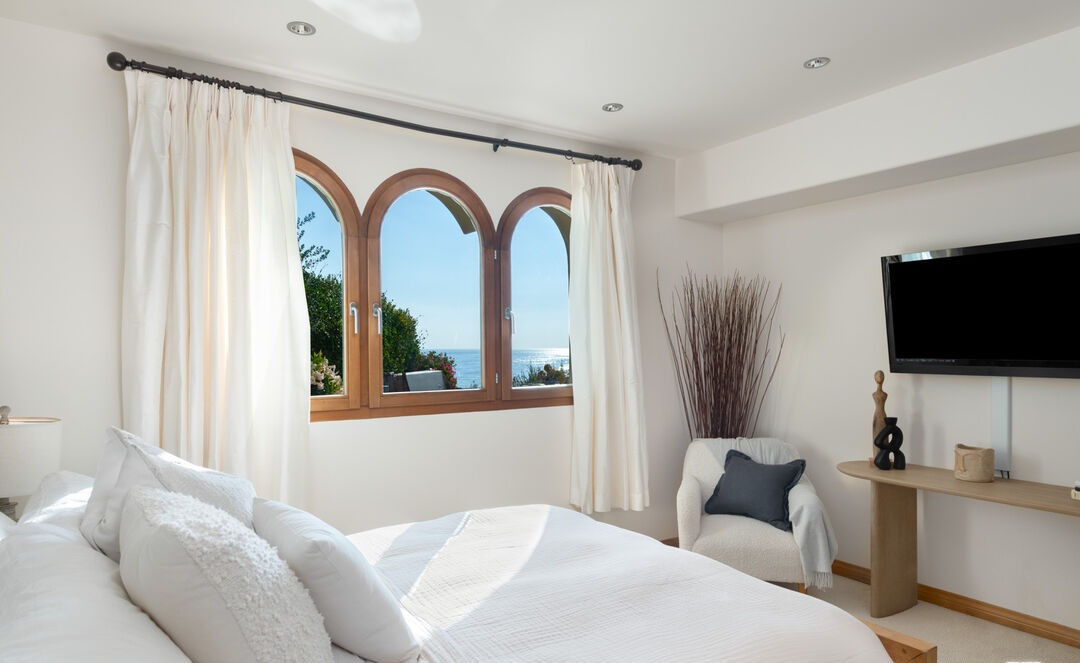 A serene primary bedroom featuring abundant natural light through three striking arched wooden-frame windows with ocean views, characterized by clean lines, soft whites and creams, and warm natural wood accents. The space balances coastal elegance with organic modern sensibilities, creating a sophisticated yet inviting retreat with curated furnishings and tasteful neutral tones.