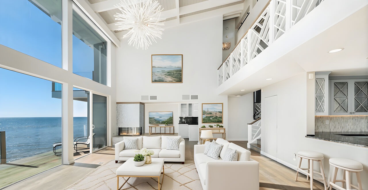 A stunning waterfront living room featuring floor-to-ceiling ocean views, coffered ceiling detailing, and a masterfully curated palette of whites, creams, and warm naturals that exemplify contemporary coastal luxury. The space seamlessly blends indoor-outdoor living with clean-lined furnishings, brass accents, and abundant natural light that creates an ethereal, serene atmosphere.
