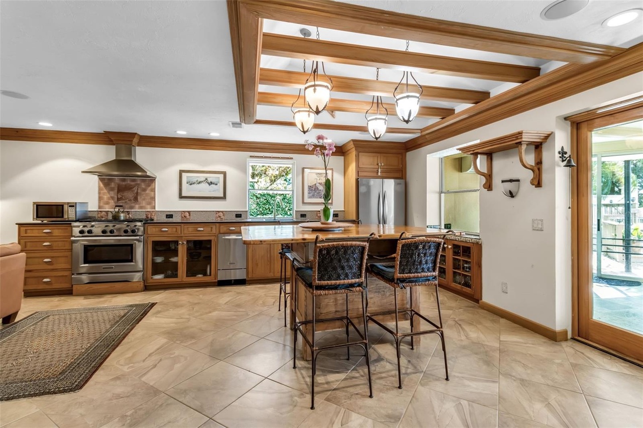 A sophisticated, light-filled kitchen featuring warm natural wood cabinetry, a substantial waterfall-edge quartzite island, and custom exposed wooden beams with skylights overhead, creating a grand yet inviting space that blends traditional millwork details with modern appliances and finishes. The open layout flows seamlessly into adjoining living areas, with statement pendant lighting and abundant natural light establishing an airy, luxurious aesthetic.