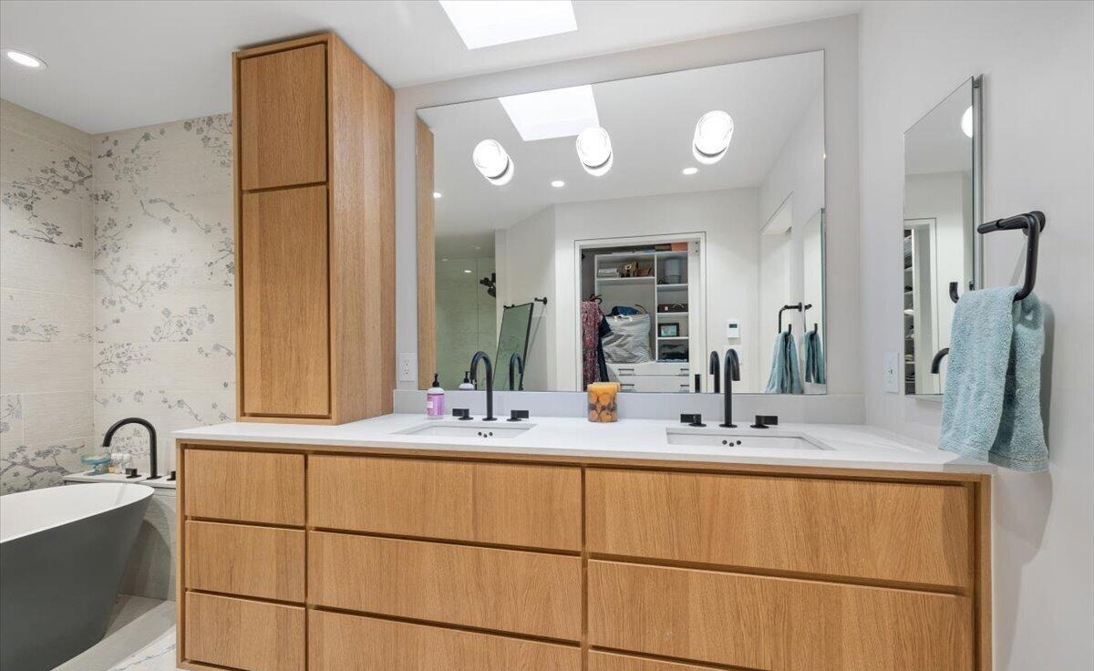 A serene primary bathroom featuring a spa-like aesthetic with light wood cabinetry, quartz countertops, and abundant natural light from skylights. The space showcases a generous double-vanity layout, freestanding soaking tub, frameless walk-in shower, and refined black hardware, balancing warmth and modern sophistication.