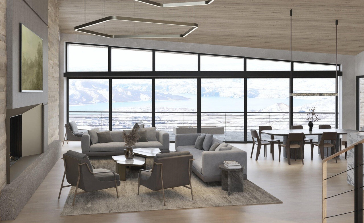 A stunning high-altitude living room overlooking expansive lake and mountain vistas, defined by floor-to-ceiling black-framed windows and a sophisticated organic-modern aesthetic. The space seamlessly blends neutral upholstery, warm wood flooring, and sculptural furnishings with dramatic pendant lighting, creating an elevated yet inviting sanctuary that celebrates its extraordinary natural surroundings.