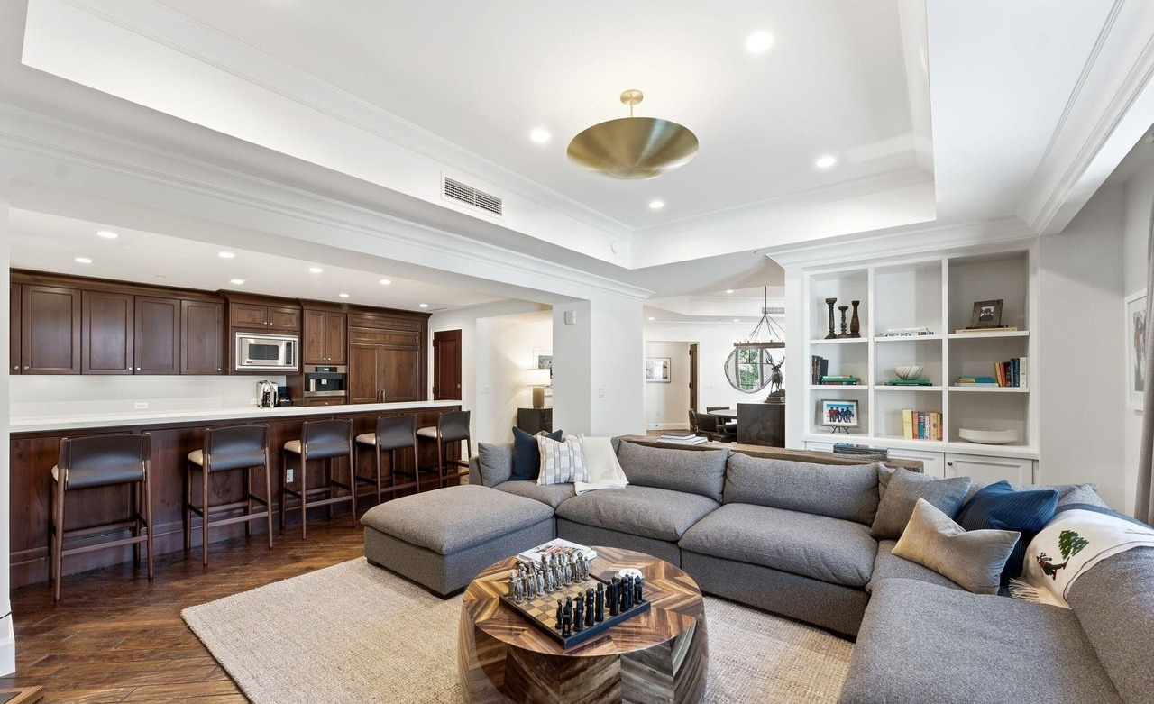 A sophisticated open-concept family room and bar that seamlessly blends traditional architectural elements—coffered ceilings, crown molding, custom built-in shelving—with warm contemporary furnishings and rich wood tones. The space exudes refined luxury through its careful material layering, brass accents, and thoughtful lighting design, creating an inviting yet polished gathering area.