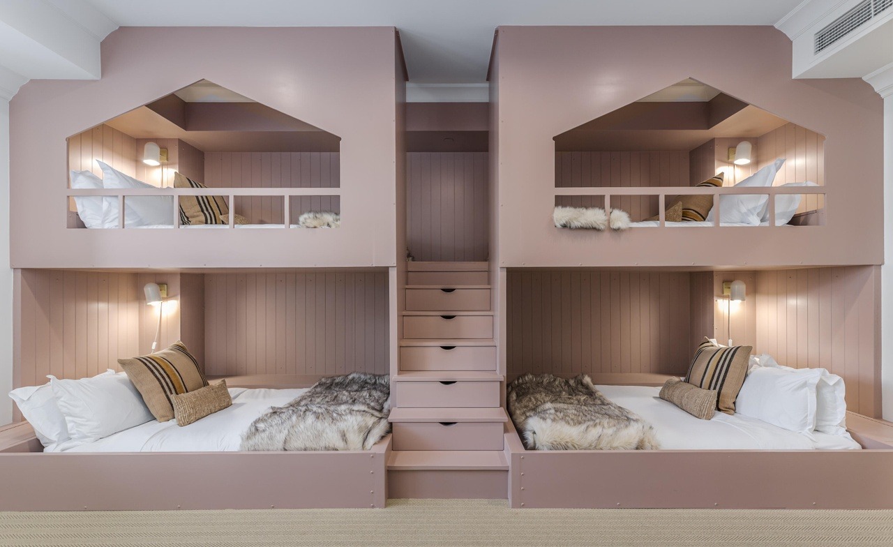 A stunning luxury children's bedroom featuring custom-built bunk beds with integrated shelving, sophisticated dusty rose and taupe tones, and architectural detailing including wainscoting and barn-style window nooks. The design combines warm traditional millwork with contemporary minimalist sensibilities, creating an elevated residential space that balances playfulness with refined elegance.