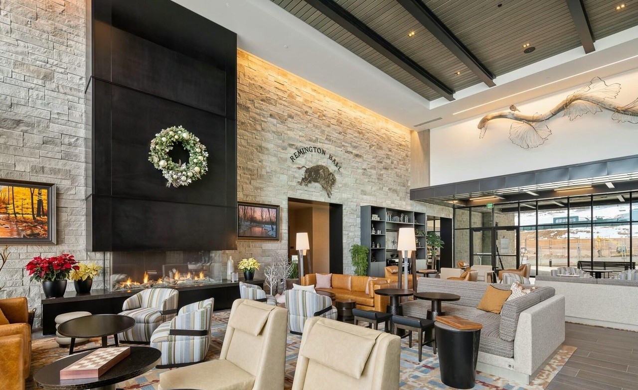 A breathtaking luxury great room featuring a dramatic two-story stone fireplace wall anchored by a linear gas fireplace, paired with custom black metal shelving and warm wood beam ceiling detailing. The space exemplifies transitional design through traditional architectural bones—soaring ceilings, substantial stonework, and exposed beams—refined with contemporary furnishings in cream, camel leather, and warm neutrals, creating a sophisticated yet inviting sanctuary flooded with natural light from expansive windows.