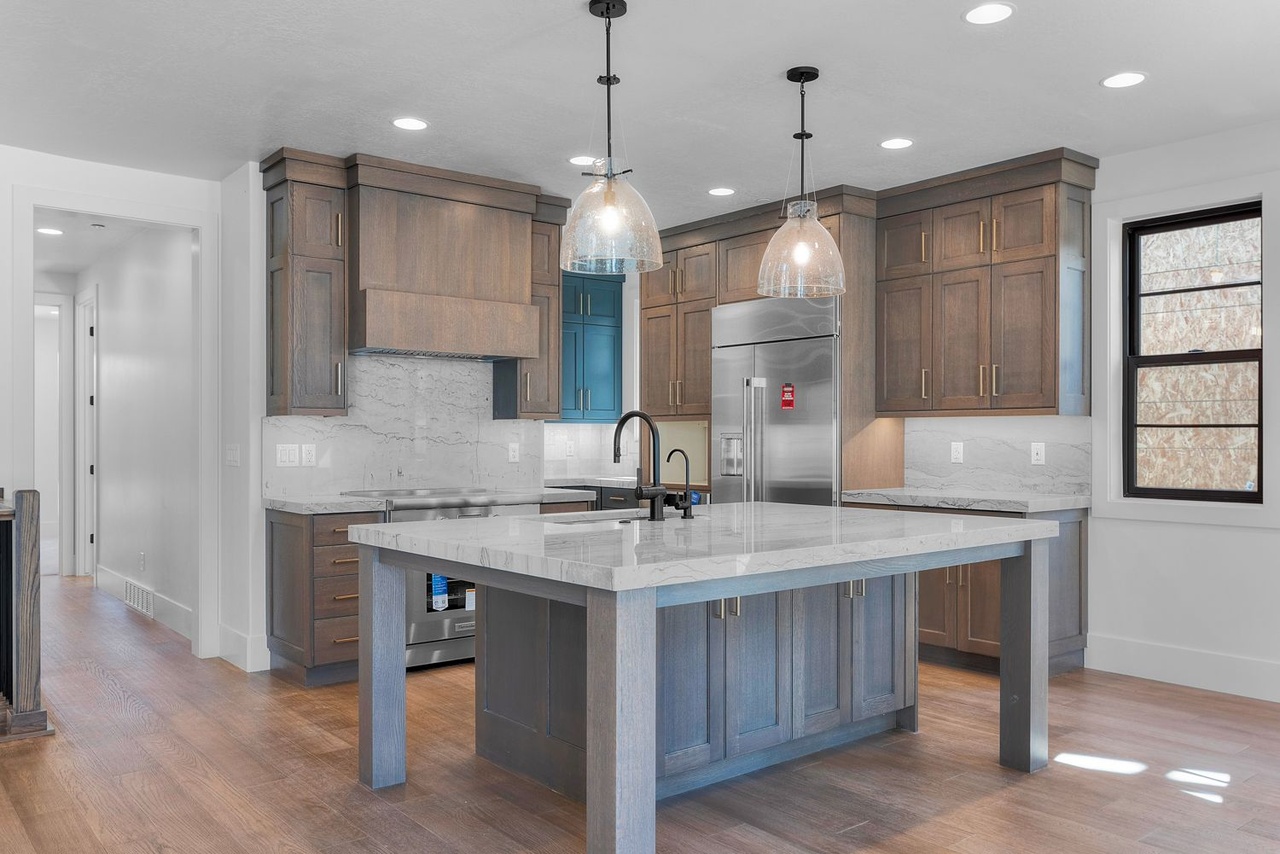 Waterfall IslandLarge IslandPendant LightingStainless Steel AppliancesOpen ConceptCrown MoldingRecessed LightingStatement LightingTeal Accent TowerBlack FaucetHigh Ceilings