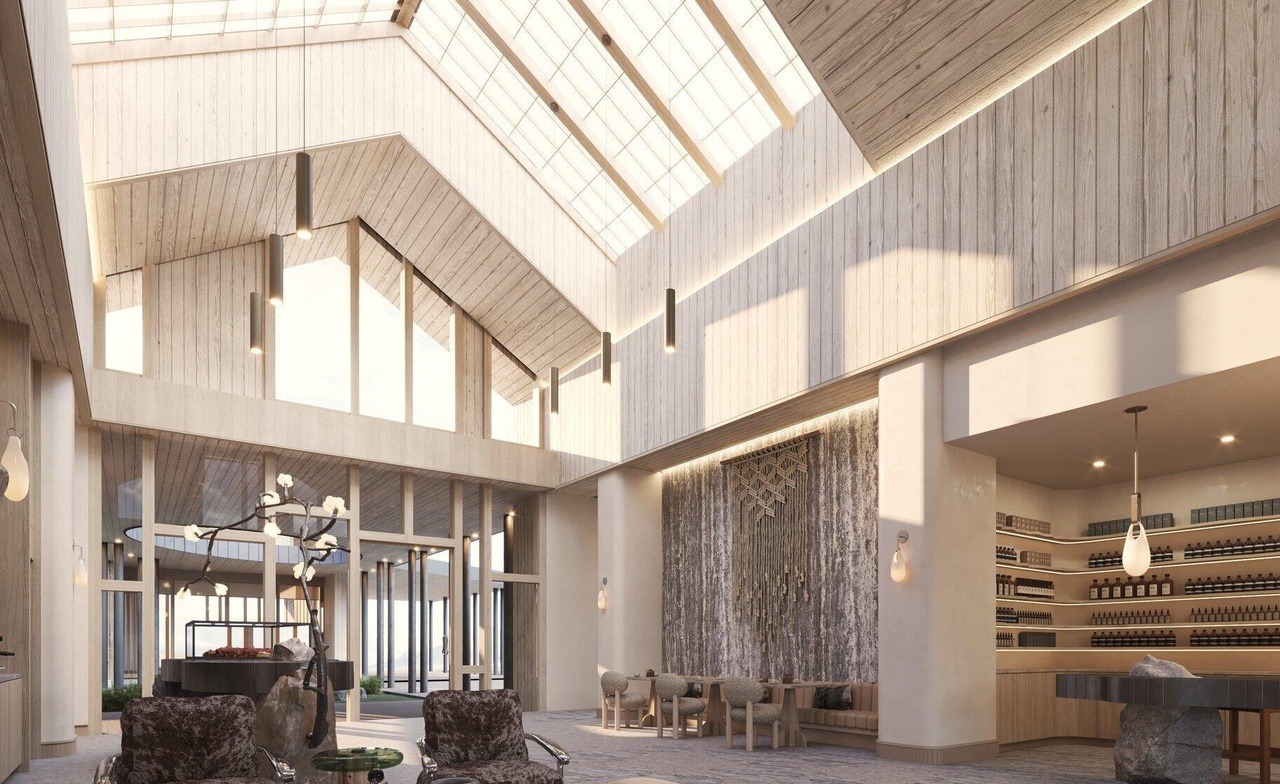 A breathtaking high-ceilinged entryway flooded with natural light through extensive skylights and floor-to-ceiling windows, featuring soaring wood-paneled vaults and warm stone floors. The space masterfully blends organic modern warmth with transitional elegance through carefully curated furnishings, macramé wall art, pendant lighting, and a minimalist fireplace accent, creating a serene yet grand arrival experience.