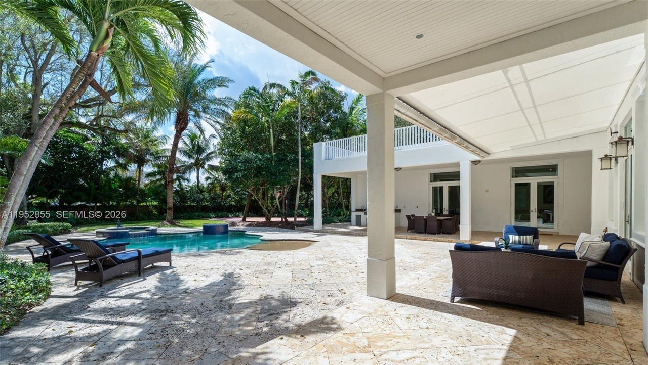 This expansive tropical pool area features a resort-style aesthetic with pristine stone decking, a sparkling blue saltwater pool with integrated hot tub, and lush mature palm trees creating a private oasis. The sophisticated design seamlessly blends outdoor living with refined furnishings and clean architectural lines, elevated by abundant natural light and impeccable landscaping.
