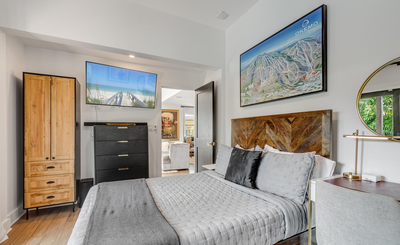 A serene primary bedroom featuring a striking walnut geometric headboard and high-end furnishings in warm neutrals, anchored by natural hardwood flooring and abundant natural light from expansive windows. The space masterfully blends transitional architectural details with organic modern furnishings, creating a sophisticated yet inviting retreat enhanced by brass and black hardware accents and ski resort artwork.