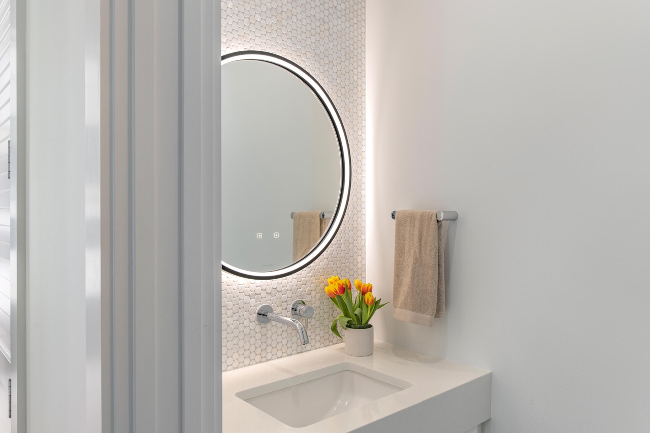 A sophisticated powder room featuring a minimalist floating vanity with warm-toned quartz countertop and a striking black-framed circular mirror set against delicate penny-round tile backsplash. Fresh yellow tulips and soft neutral palette create an elegant, spa-like atmosphere with excellent attention to modern detail and material quality.