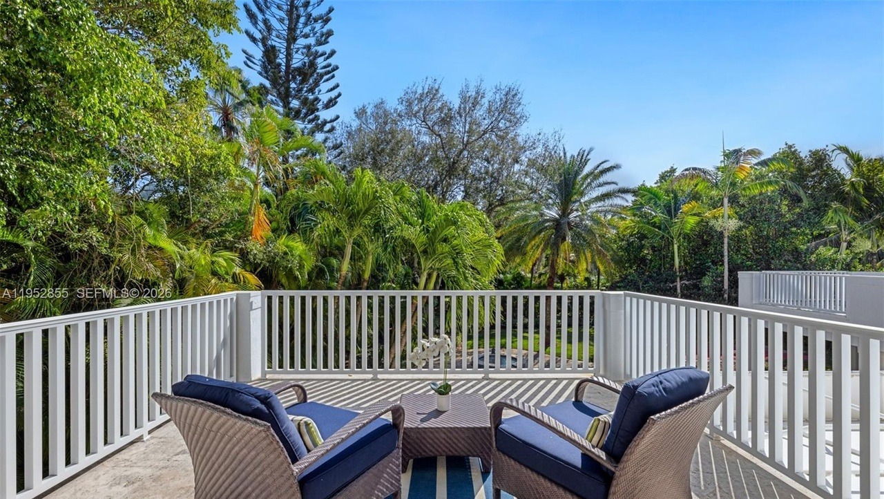 An elegantly designed patio featuring a pair of woven rattan lounge chairs with deep navy cushions positioned for conversation over a stylish striped area rug and wooden accent table. The space is framed by pristine white railings and surrounded by lush tropical landscaping, creating a sophisticated yet relaxed outdoor retreat that perfectly balances coastal simplicity with contemporary luxury.