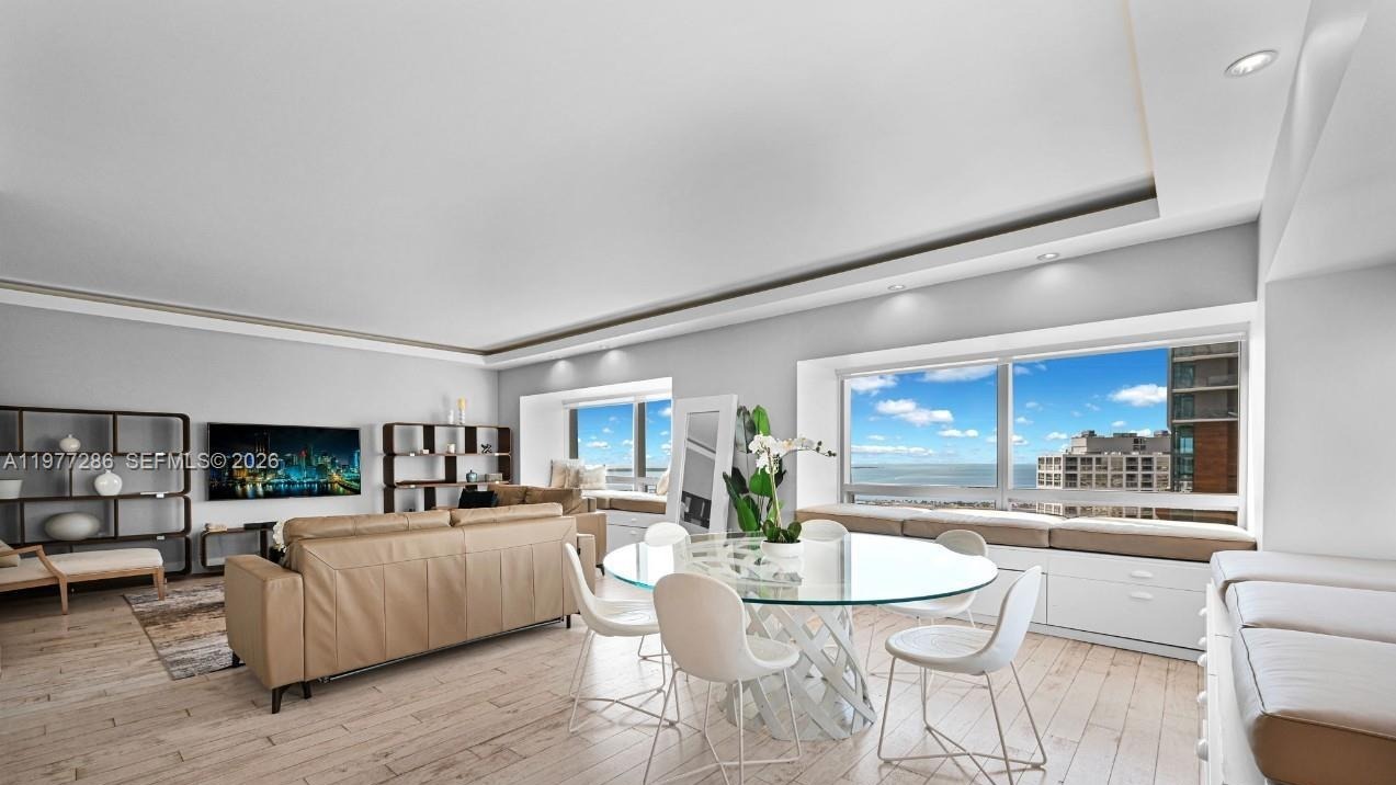 A stunning high-rise living room seamlessly blending organic and transitional design with floor-to-ceiling windows framing expansive ocean and cityscape views. The neutral palette of whites, beiges, and warm wood flooring is anchored by premium furnishings—a tailored tan leather sofa, elegant round glass dining table with sculptural white chairs, and curated shelving—creating an airy yet sophisticated sanctuary with exceptional natural light and refined modern comfort.