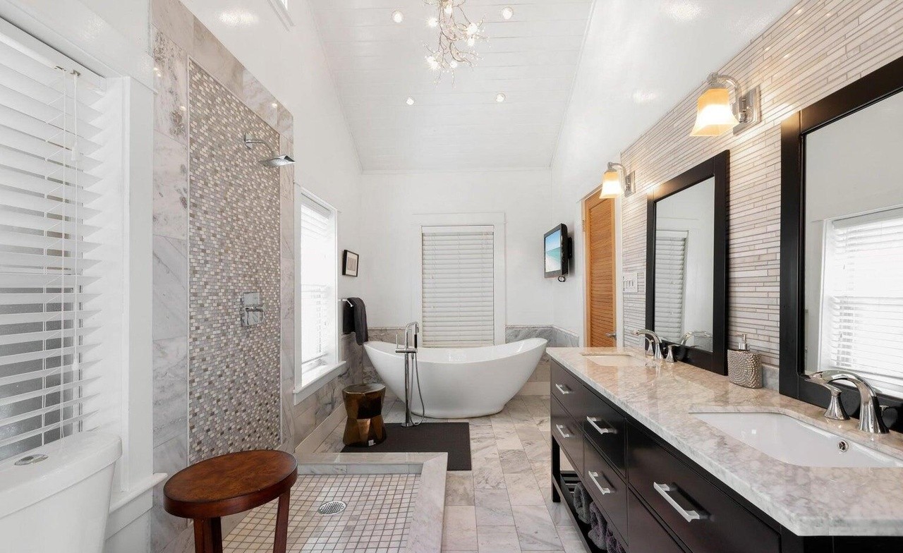 Countertop: MarbleCabinets: Dark PaintedCabinet Color: Dark GrayFlooring: MarbleCeiling: StandardVanity: Marble Top Double SinkShower: Frameless GlassTub: FreestandingTile: Mosaic
