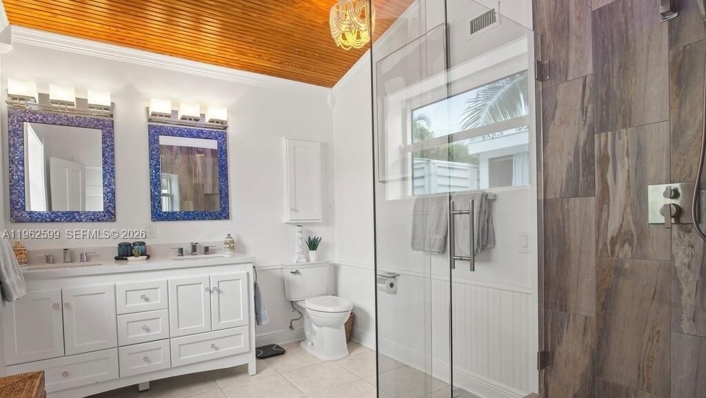 Double VanityFrameless Glass ShowerWalk In ShowerStatement Mirrors With Mosaic FramesWood Plank CeilingHigh CeilingsNatural LightStatement LightingWindow In ShowerHeated Towel Rack