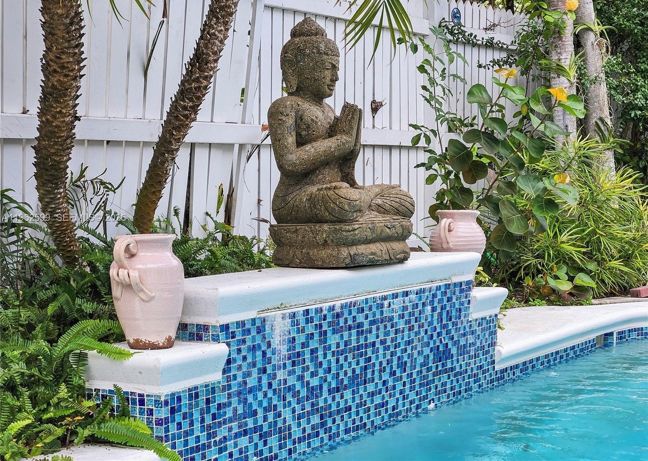 A stunning tropical pool area featuring a pristine turquoise swimming pool lined with intricate blue mosaic tiles and crisp white stone surrounds, anchored by a contemplative carved stone Buddha statue. The space is elegantly framed by mature palms, flowering vines, and decorative terracotta urns against a serene white pergola backdrop, creating a resort-like oasis that seamlessly blends spa-inspired tranquility with high-end outdoor design.