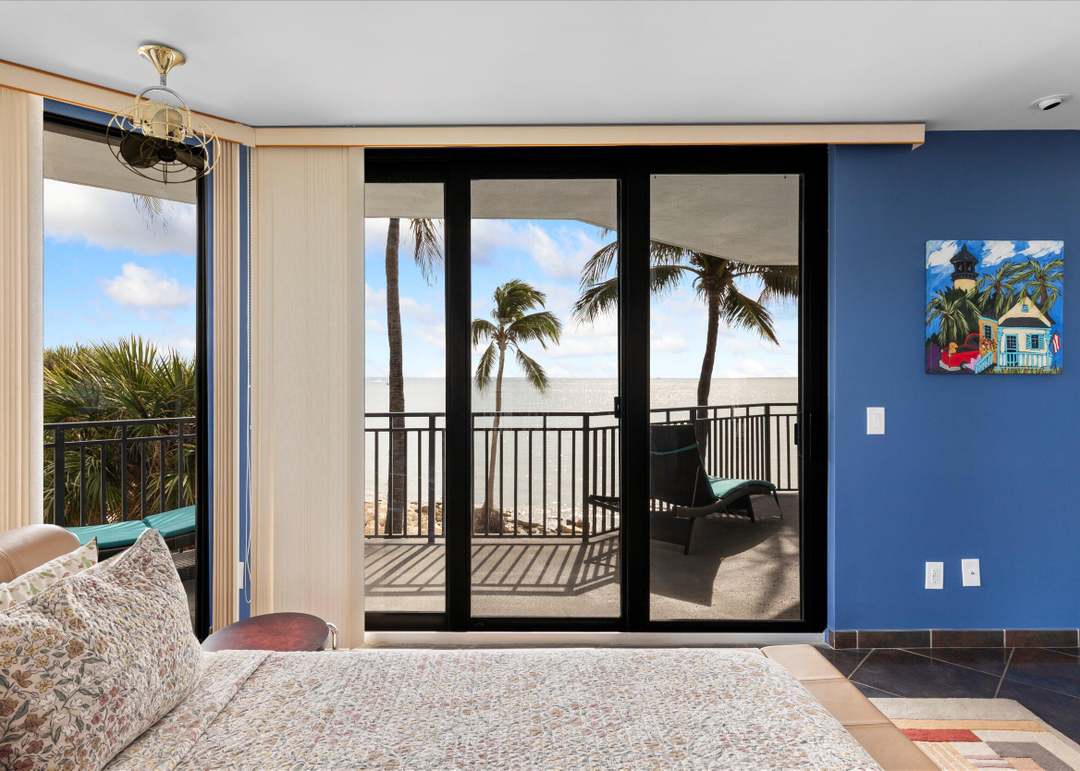 A stunning tropical-coastal primary bedroom with soaring ocean views framed by floor-to-ceiling glass doors and abundant natural light. The sophisticated palette of navy blue accent walls, soft beige bedding, and brass fixtures creates an elevated resort-like atmosphere enhanced by palm tree vistas and high ceilings with refined crown molding.