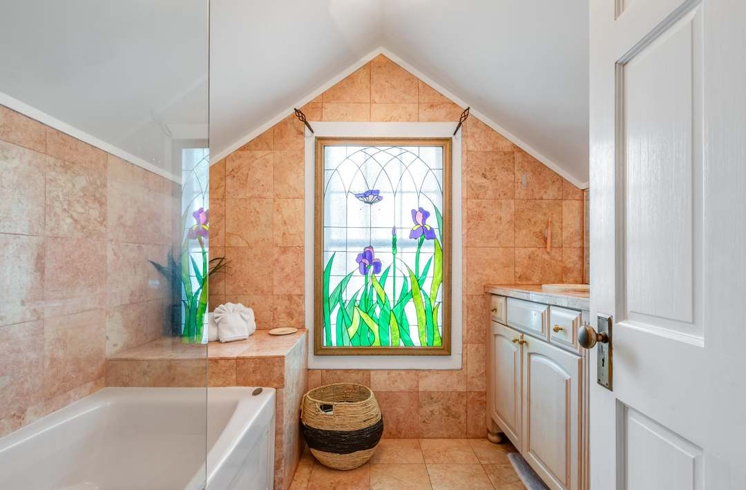 Stained Glass WindowVaulted CeilingBuilt In TubFrameless ShowerSkylightWainscotingArched Ceiling DetailCustom Millwork