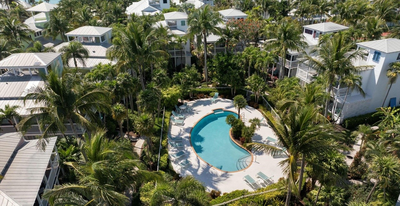 A resort-style community pool area featuring a kidney-shaped turquoise pool surrounded by pristine white concrete decking and lush tropical landscaping with tall palm trees. White multi-story residential buildings with metal roofs frame the serene pool environment, creating an upscale tropical resort atmosphere with abundant natural light and elegant simplicity.