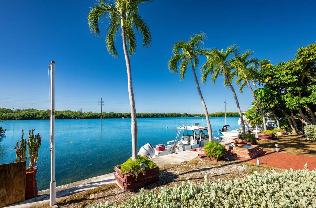 A stunning waterfront patio framed by mature coconut palms and lush tropical landscaping, featuring pristine turquoise water views and a private boat dock. The space exemplifies tropical luxury living with stone paving, terra cotta accents, and direct waterfront access in what appears to be a premier coastal destination.