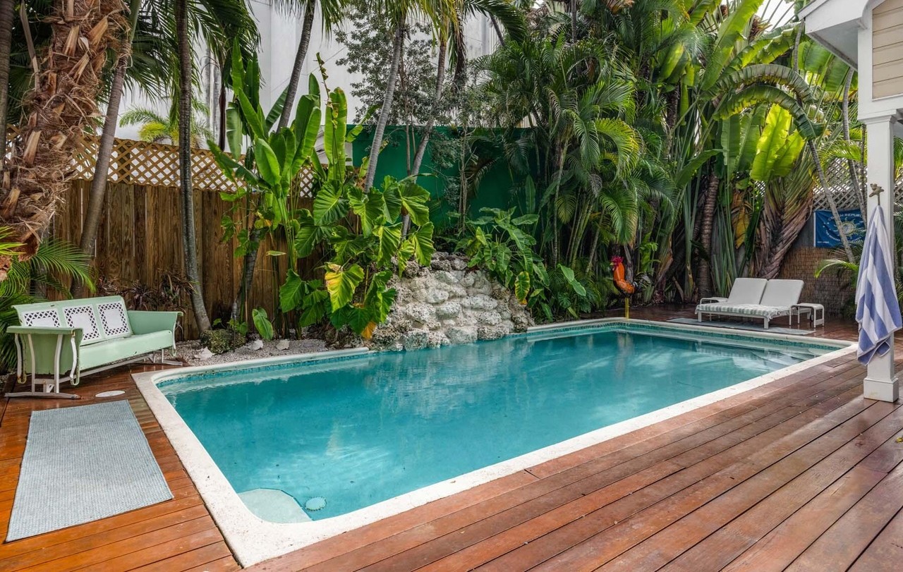 A stunning tropical resort-style pool area featuring a sparkling turquoise pool surrounded by rich hardwood decking and lush, vibrant landscaping with towering palms and sculptural rock formations. The space seamlessly blends relaxation with sophisticated design, offering abundant natural light and creating an exclusive private oasis with elegant lounge furnishings and resort-quality finishes.
