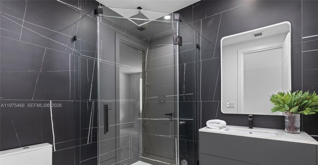 Walk In ShowerFrameless Glass EnclosureFloating VanityFreestanding TubRainfall ShowerheadLighted MirrorStatement LightingDouble Vanity