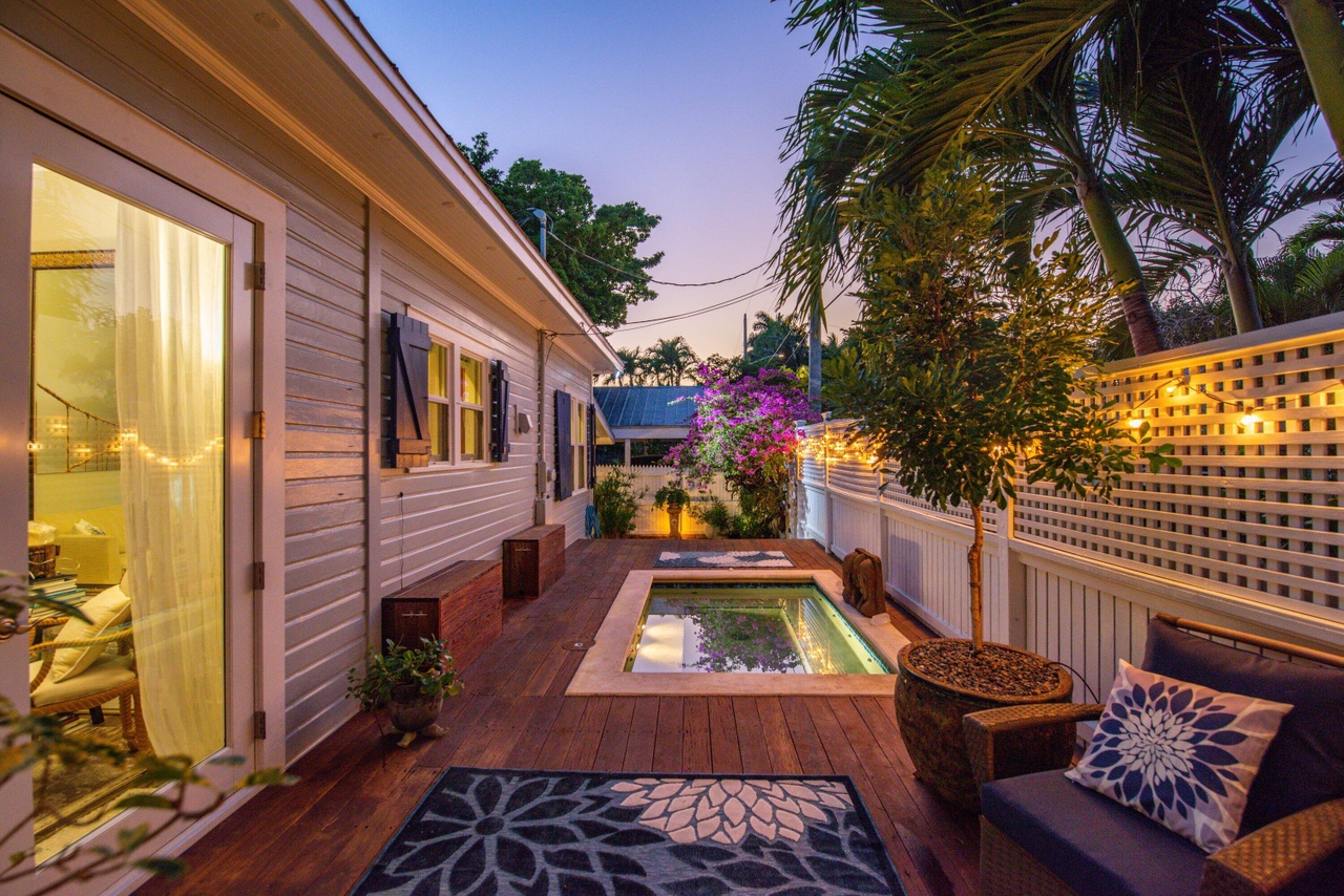 A stunning covered patio with white horizontal shiplap walls and warm hardwood flooring, featuring a modern rectangular fireplace and lush tropical landscaping with bougainvillea and palm trees. The space exemplifies coastal luxury living with sophisticated furnishings, professional lighting design, and seamless indoor-outdoor flow captured in golden hour photography.