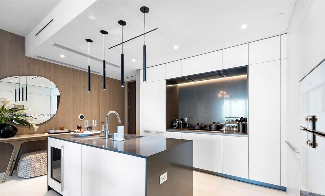 A stunning ultra-luxury kitchen featuring a minimalist aesthetic with clean-lined white cabinetry, a dramatic waterfall-edge quartz island, and warm walnut wood accent walls that provide organic warmth. The space is elevated by bespoke black pendant lighting, sophisticated gray-toned counters, professional-grade finishes, and marble flooring, creating an editorial-quality design that balances contemporary minimalism with organic material richness.