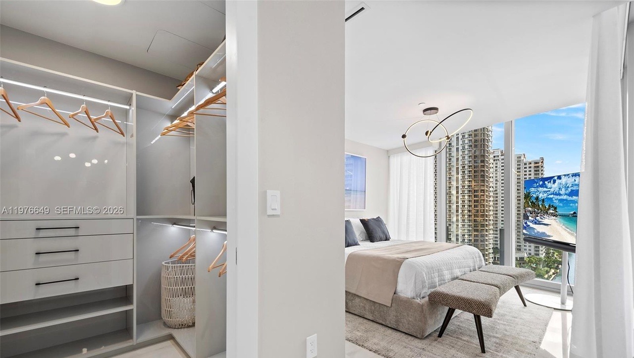 A sophisticated primary bedroom suite with seamlessly integrated en-suite bathroom, featuring floor-to-ceiling windows overlooking high-rise cityscapes and a serene color palette of whites, grays, and warm neutrals. The design combines minimalist aesthetics with organic materials and statement lighting, creating an airy yet luxurious sanctuary.