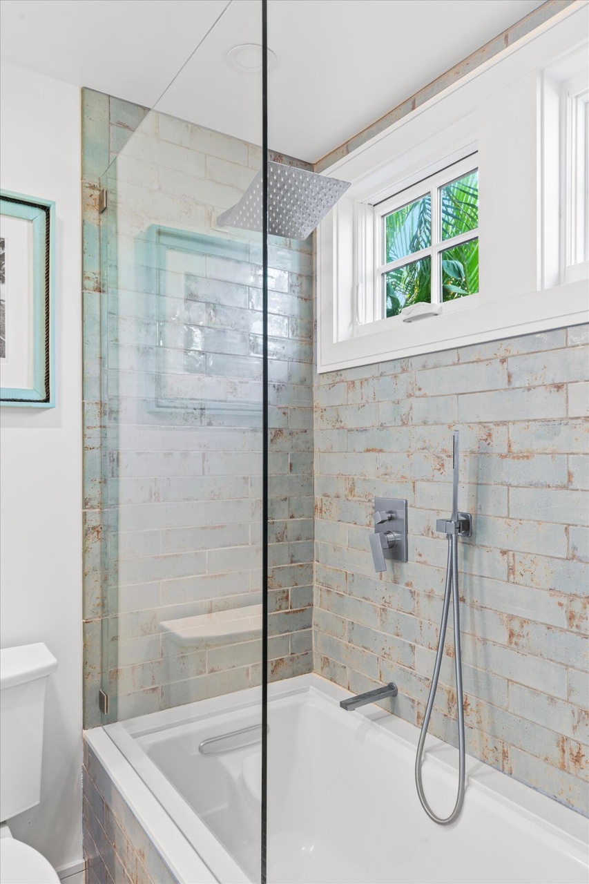 Walk In ShowerFrameless Glass EnclosureRain ShowerheadHand ShowerWhite Subway TileDistressed Terra Cotta Accent TileSkylightNatural Light From WindowsHigh CeilingsCrown Molding