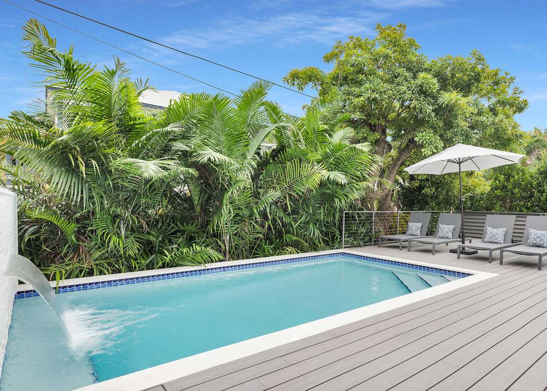 A stunning resort-style pool area featuring a pristine turquoise swimming pool with ceramic tile border, surrounded by composite gray decking and lush tropical landscaping with mature palm trees. The space is anchored by contemporary gray loungers under a crisp white patio umbrella, creating an inviting outdoor oasis with abundant natural light and a serene, luxurious ambiance.