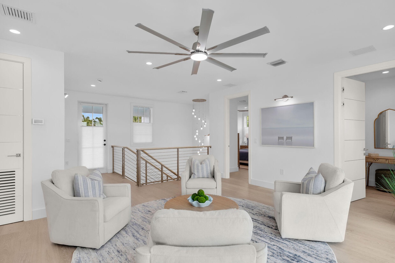 A sophisticated open-concept family room bathed in natural light, featuring a curated seating arrangement with cream upholstered furniture, warm wood accents, and a striking multi-blade ceiling fan. The space balances clean contemporary lines with transitional details like crown molding and a working fireplace, creating an airy yet warm coastal-inspired sanctuary with careful attention to material quality and proportion.