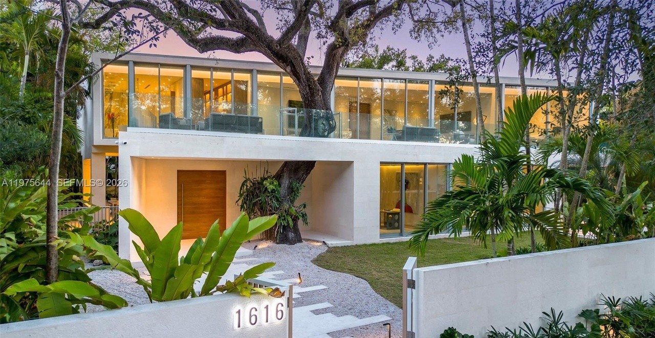 A stunning modern courtyard with a mature native tree anchoring a minimalist landscape design featuring geometric gravel pathways and manicured lawn. The adjacent two-story residence features extensive floor-to-ceiling glazing and clean modernist architecture, creating seamless indoor-outdoor flow with an emphasis on natural light, negative space, and organic elements set within a refined geometric framework.