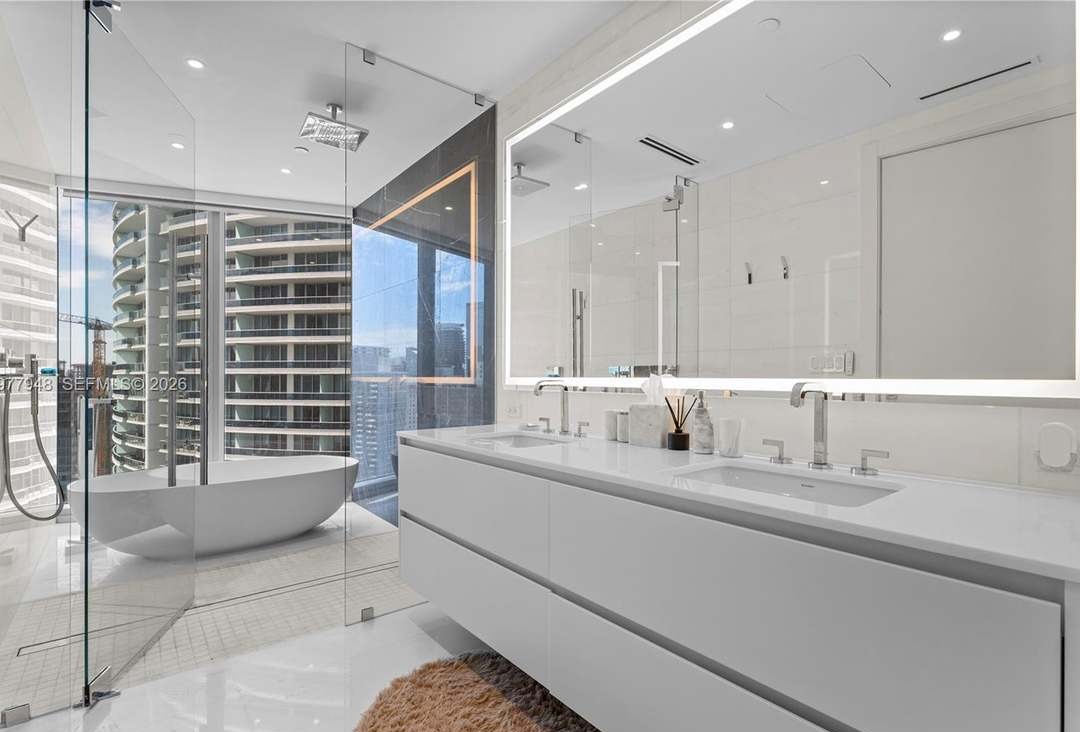 Double VanityFloating VanityFreestanding TubWalk In ShowerFrameless GlassFloor To Ceiling WindowsHigh CeilingsRecessed LightingRainfall Showerhead