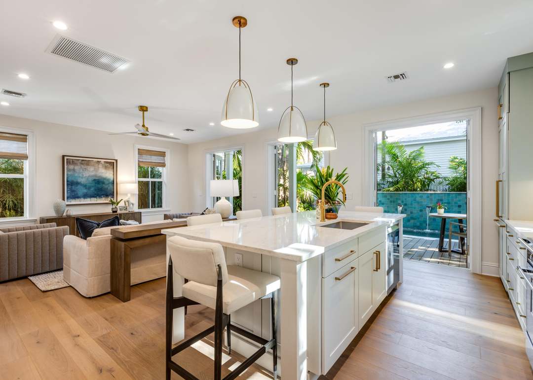 A stunning open-concept kitchen featuring a sculptural white island with waterfall countertop, brass pendant lighting, and expansive floor-to-ceiling windows framing lush tropical views. The space seamlessly blends contemporary luxury with organic warmth through natural materials, refined hardware, and a serene neutral palette accented by sage green cabinetry visible through the adjacent indoor-outdoor living area.