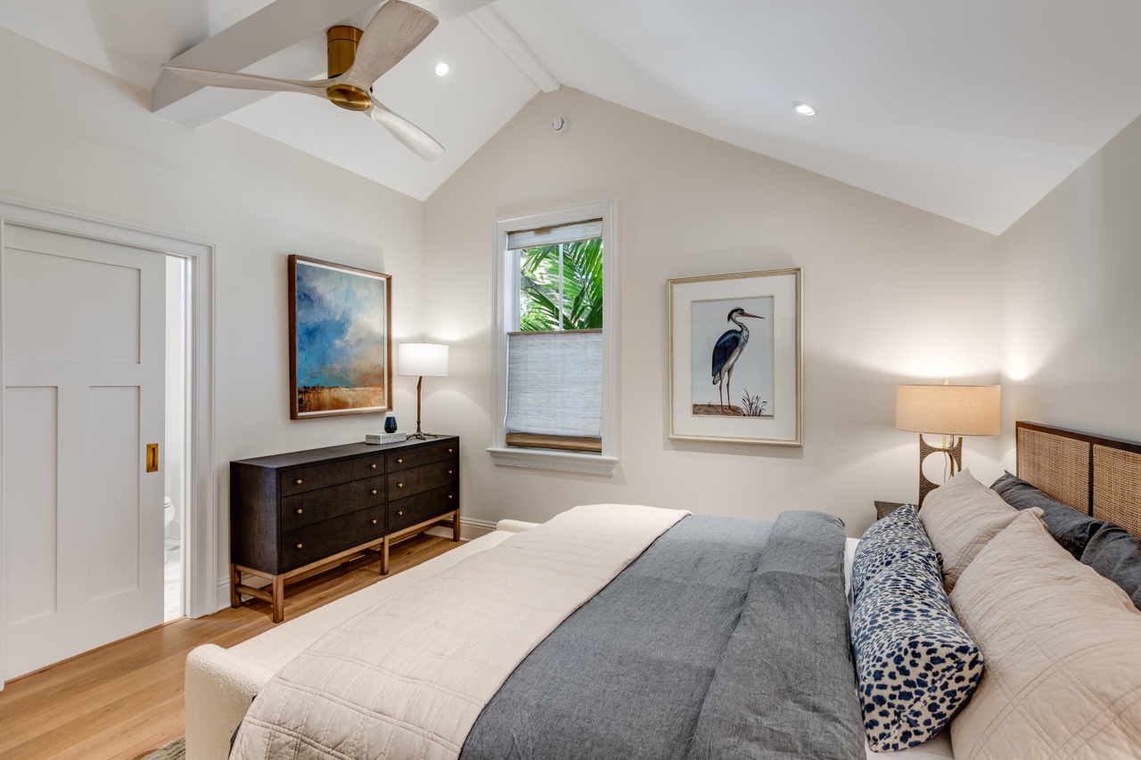 This serene primary bedroom features a sophisticated transitional design with warm, neutral tones anchored by a walnut dresser and natural-wood rattan headboard. Abundant natural light floods through the skylight and window, creating an airy, luxurious retreat enhanced by layered textures, coastal artwork, and refined brass-finished fixtures.
