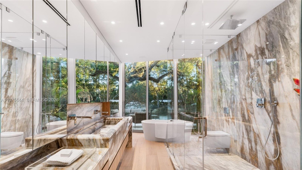 Freestanding Soaking TubFrameless Glass ShowerDouble VanityFloating VanityFloor To Ceiling WindowsLarge Format Marble SurroundWalk In ShowerRecessed LightingRainfall ShowerheadNatural Light Abundance