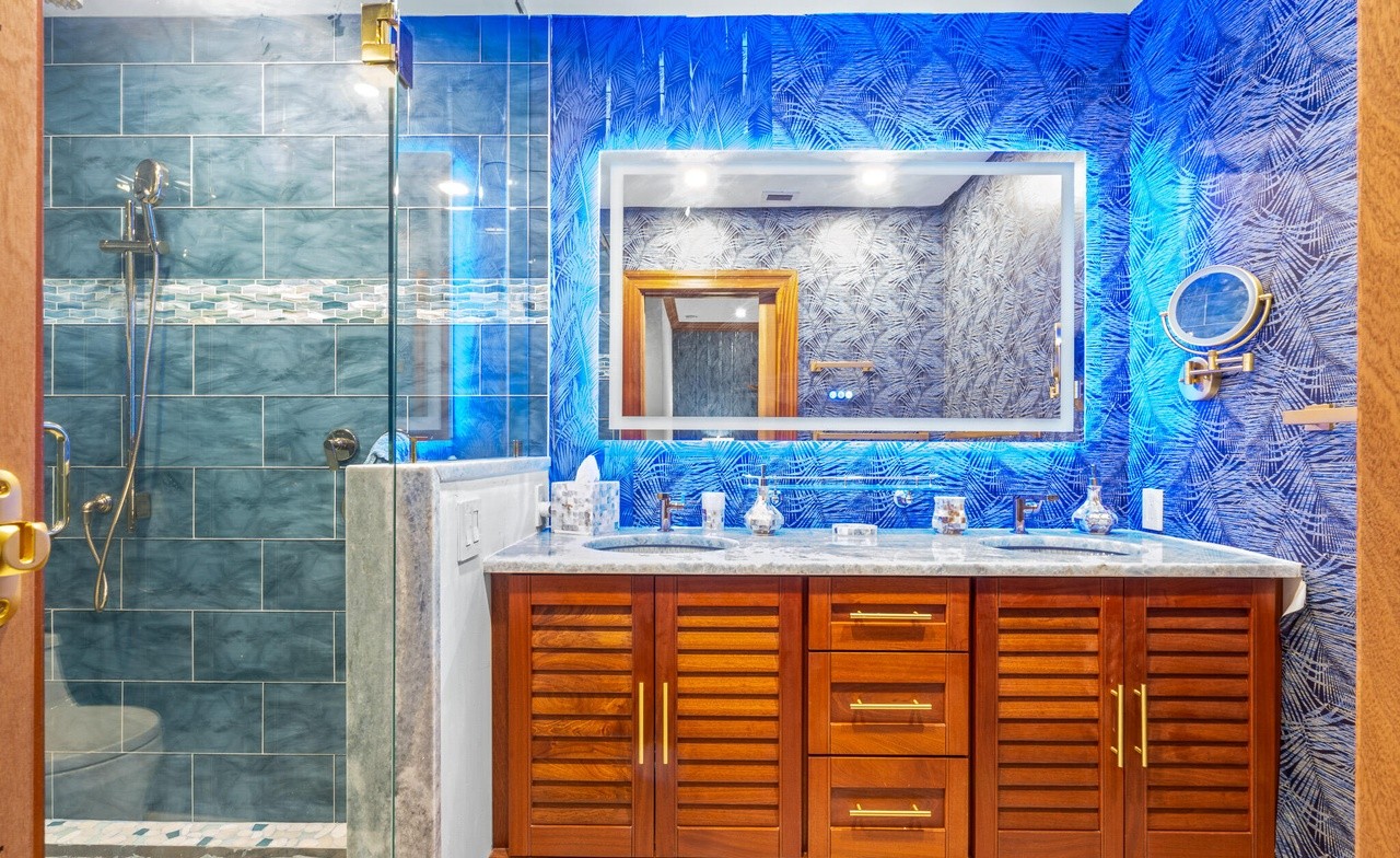 A sophisticated primary bathroom featuring a striking cobalt blue patterned tile accent wall that creates dramatic visual impact, complemented by a rich dark wood double vanity with marble countertop and brass hardware. The frameless glass shower enclosure with sea-green subway tiles and integrated lighting mirror elevate the overall luxe aesthetic.