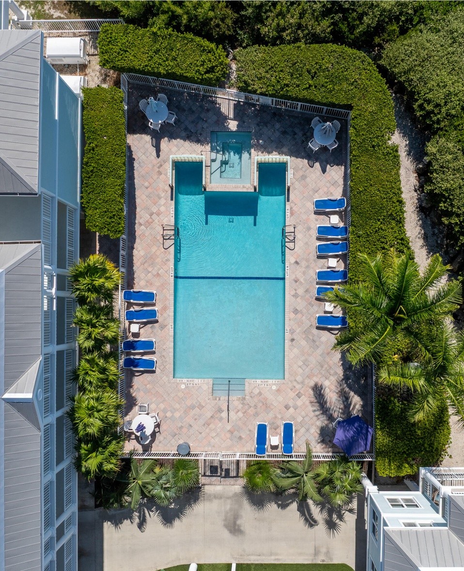 A pristine resort-style pool area featuring a bright turquoise lap pool surrounded by symmetrical lounge seating with navy cushions and manicured hedging. The elegant outdoor space combines coastal luxury with contemporary design, enhanced by mature palm trees and a pergola-covered lounge area that creates an inviting retreat atmosphere.