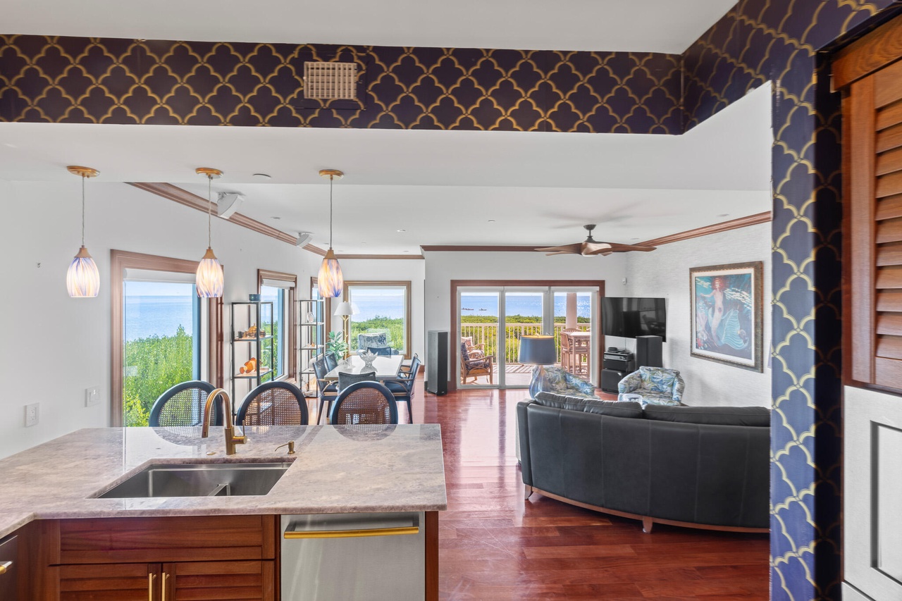 A sophisticated open-concept living and kitchen space featuring abundant natural light through expansive floor-to-ceiling windows, warm hardwood flooring, and a marble-topped island with brass pendant lighting. The room combines transitional elegance with organic modern warmth through its mix of traditional millwork details (crown molding, exposed beams) and contemporary furnishings, anchored by a striking navy geometric wallpapered accent wall.