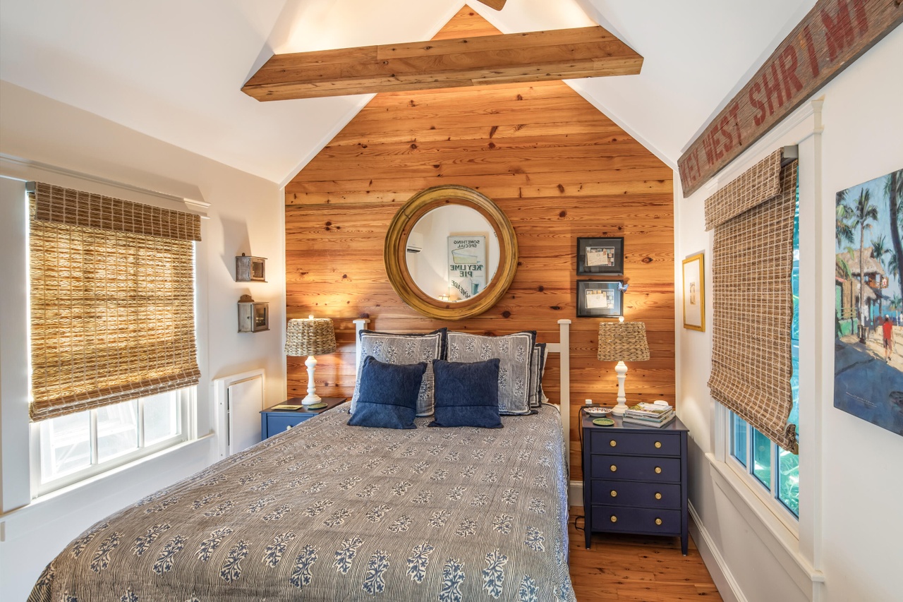 This charming coastal-inspired guest bedroom features dramatic vaulted ceilings with exposed wooden beams and warm golden pine wood paneling that creates an intimate, cottage-like retreat. The space balances rustic warmth with refined furnishings—navy accents, brass-trimmed nightstands, and tailored bedding—creating a serene sanctuary with abundant natural light and sophisticated comfort.